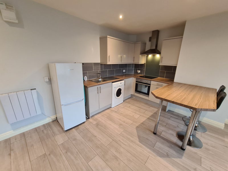 Modern open plan fitted kitchen with oven & hob, washer/drier, fridge/freezer. Open plan lounge with two sofas and coffee table.