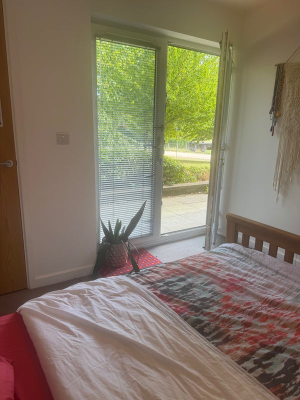 Spacious and comfortable bedroom with private en-suite on the ground floor. Includes a terrace with views of the canal and trees. Great location with easy access to shops, cafes, and transport. Minimum stay 3 months.