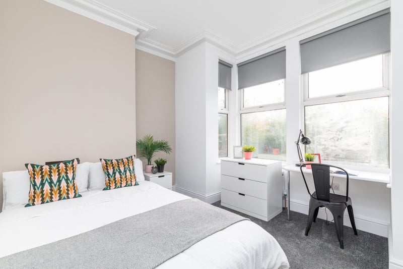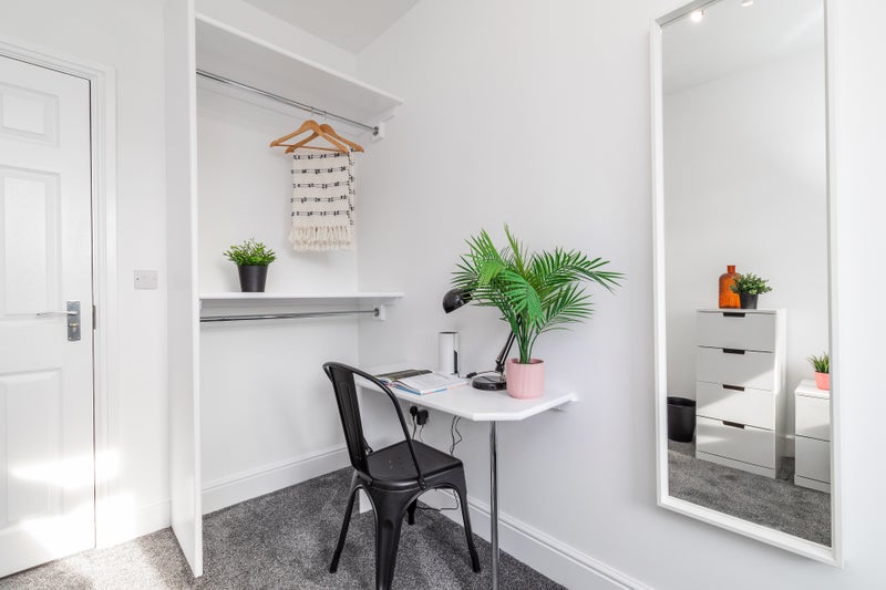 • 6 large double bedrooms, fully furnished with everything you need: double bed, wardrobe, chest of drawers, bedside table, full-length mirror, desk, and chair - ideal for both study and relaxation.