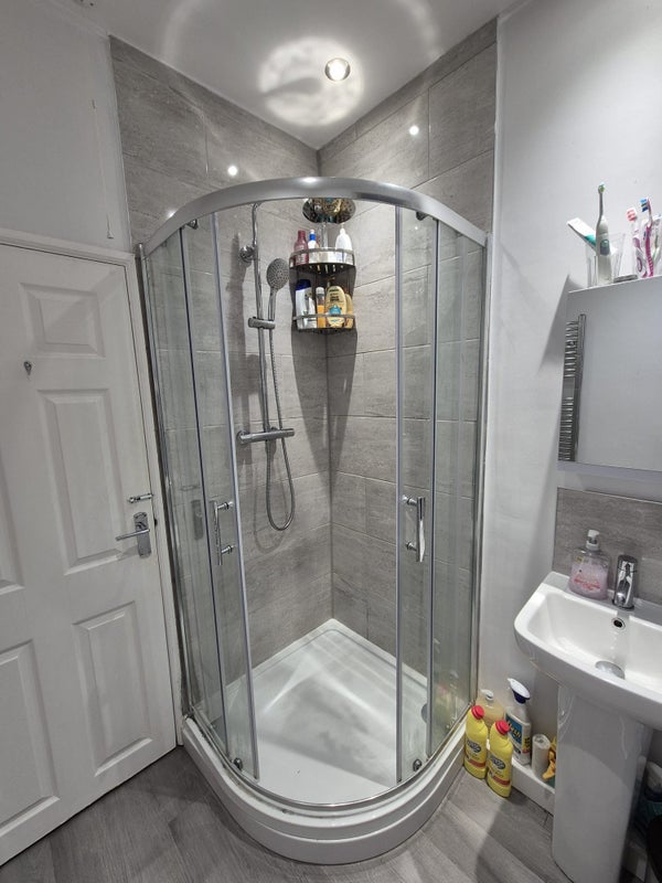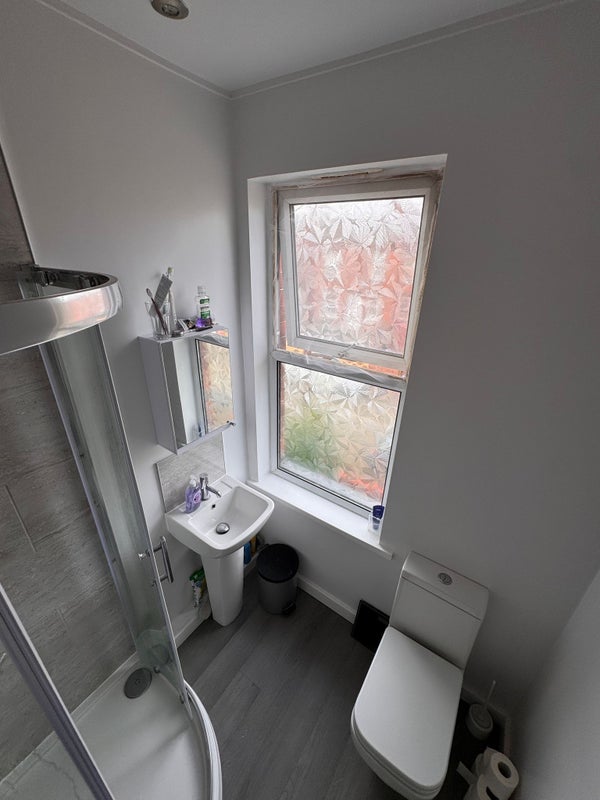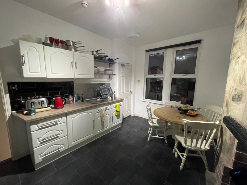 On the ground floor is a country style kitchen with a beautiful feature ingle nook fireplace which has a lovely round table and chairs painted in farrow & ball. The shared kitchen has a new cooker and hob along with a huge Bosch fridge freezer. It also has a microwave/kettle/toaster and don’t worry there’s plenty of storage for your food too!