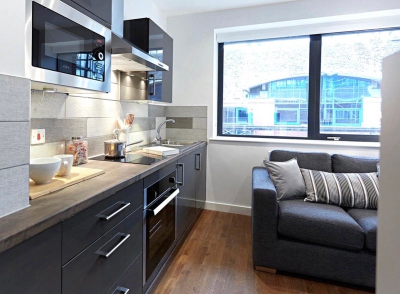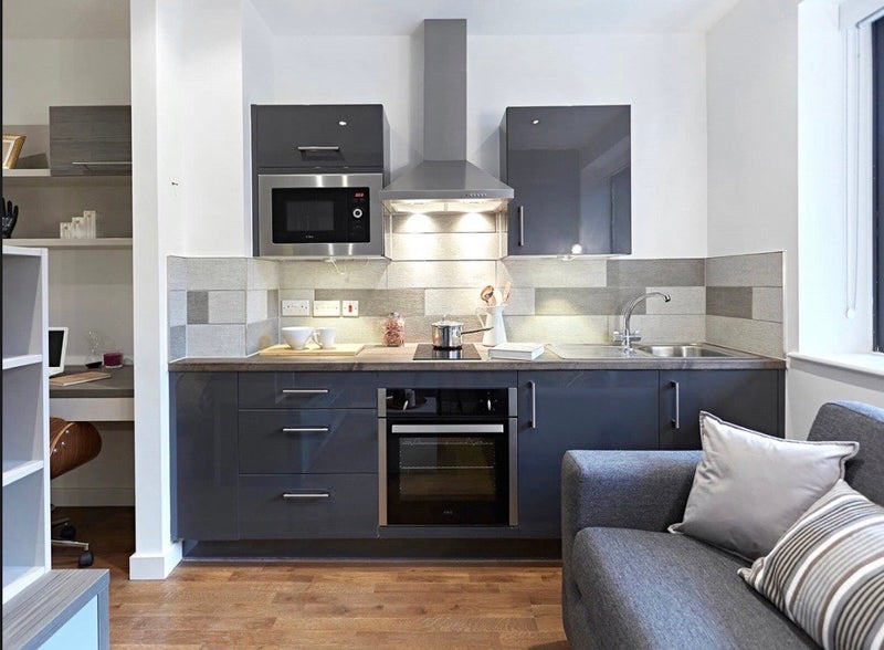 • Fully furnished studio with microwave, oven, washer–dryer, heated towel rail, and large HD TV.