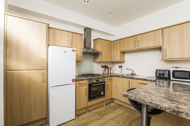 The communal kitchen and sitting area at the back of the house provide a welcoming space for socializing and cooking. The kitchen features wood effect units, a fridge-freezer, gas hob, electric oven, microwave, and washing machine.