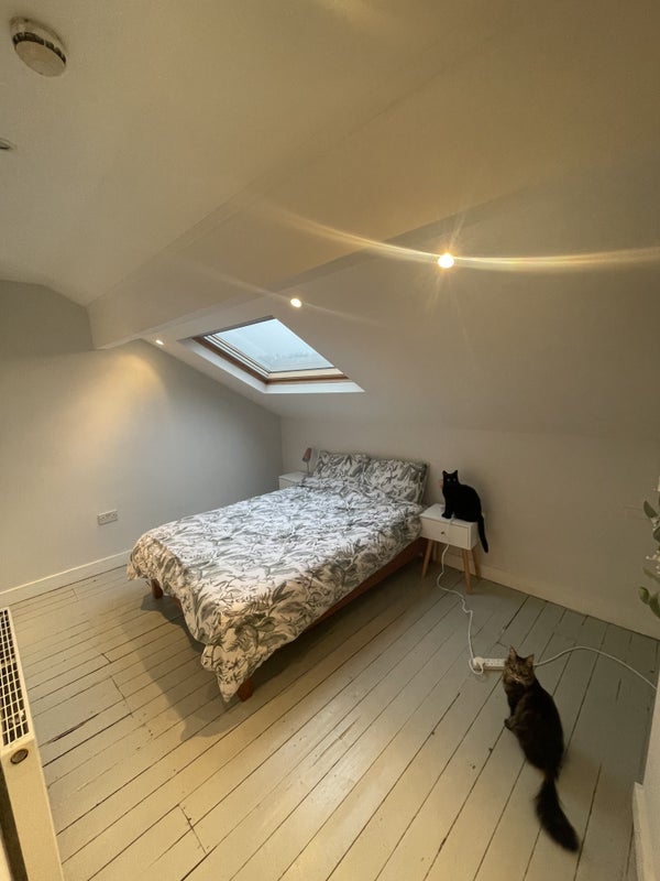 The room is a large double, attic room, currently part furnished with a double bed, bedside tables and built in wardrobe. The rent includes bills, and there is another room opposite the bedroom with a desk and chair for someone who works from home.