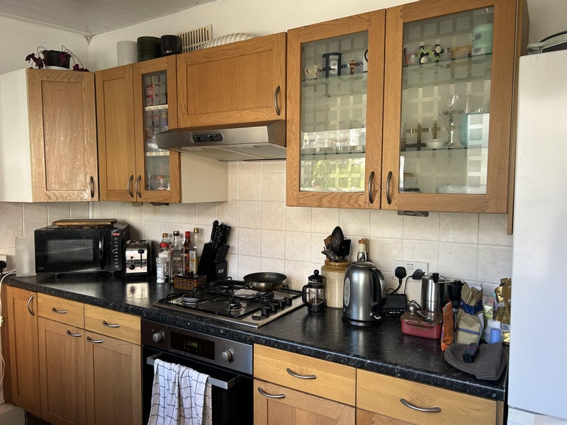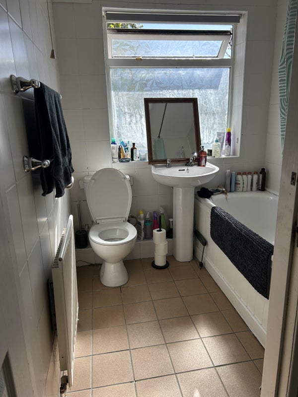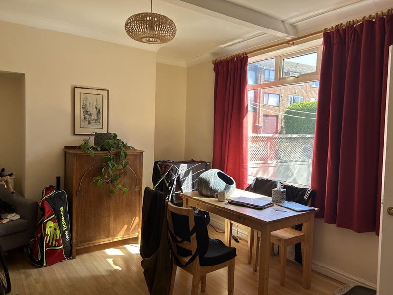 The house is spread over two floors and has a small patio to the back with a raised bed, and a small lawn to the front. There's a communal lounge, kitchen and one bathroom. The facilities are pretty basic, but with some TLC the house can look cute. There is a large dining room, where I currently store my bike, and a small spare bedroom upstairs, which is currently set up as a workspace/creative space, but obviously we can move things around if needed.