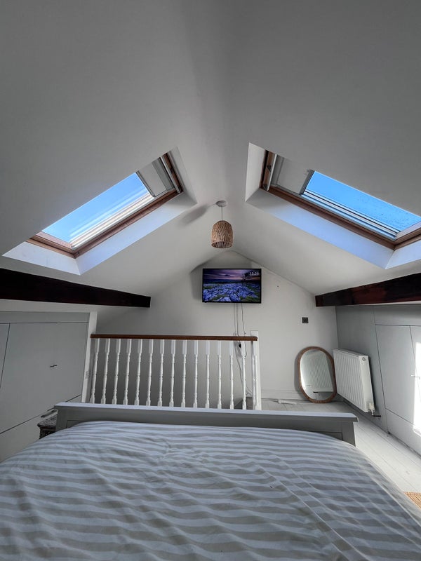 The available room is a large, bright king-size bed attic room with skylights and plenty of built-in storage along both sides of the room. It comes fully furnished with a king-size bed, bedside tables, and generous cupboard space for both hanging and folded clothes. The room has a really peaceful feel and gets lots of natural light. It has its own staircase and landing so feels really private.