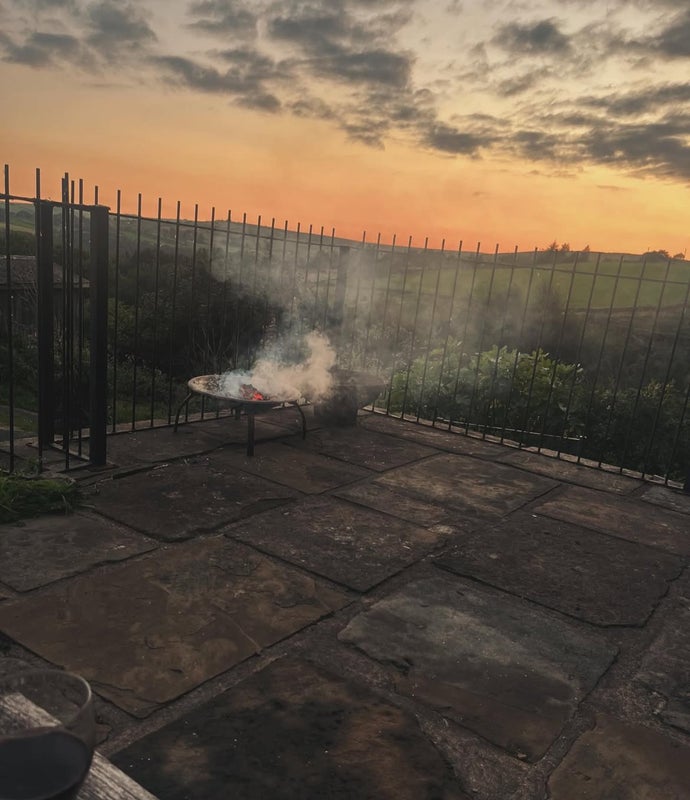 The house is surrounded by moorland and woodland, with amazing views and sunsets and is close to swimming spots and walking routes. There’s a communal outside patio with a bench and fire pit.