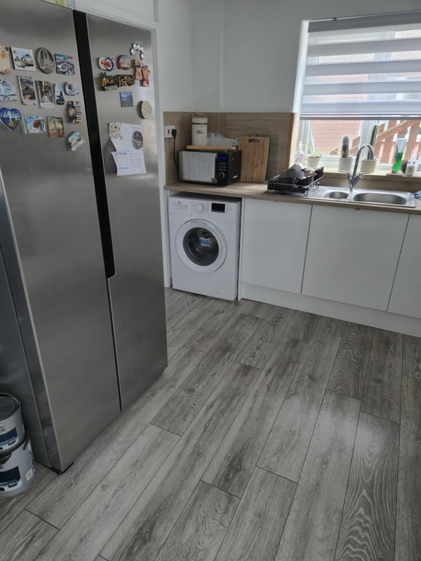 The property includes both front and rear gardens, as well as a large, well-equipped kitchen with a dining table and fridge/freezer—perfect for shared meals or relaxed evenings at home.