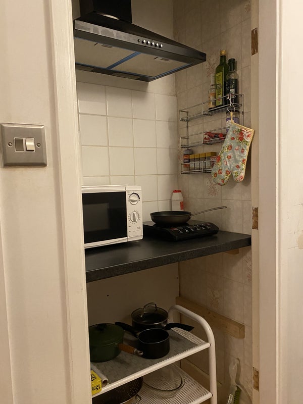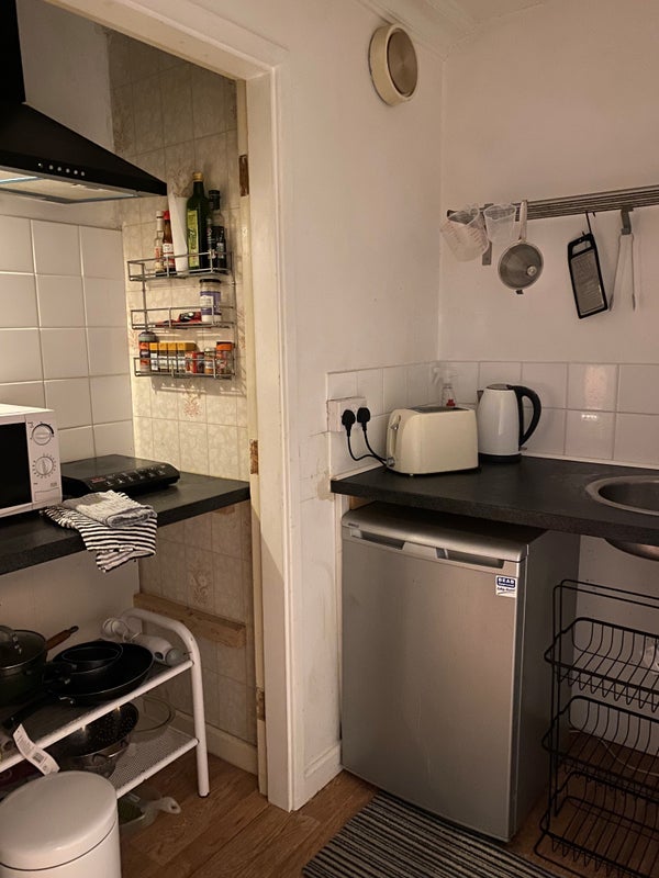 Induction hob, fridge, slow cooker, microwave/oven, sink, extractor fan, kettle, toaster.