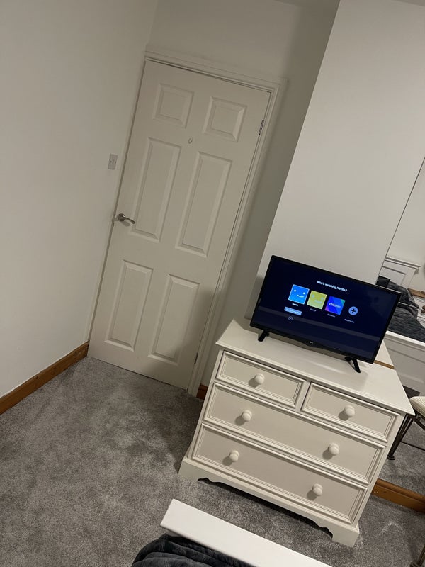 Double bed, wardrobe, chest of draws, large full length mirror, smart tv.