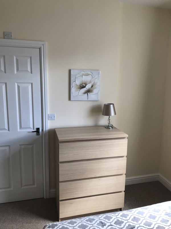 Double bed, wardrobe, chest of drawers, curtains, carpet