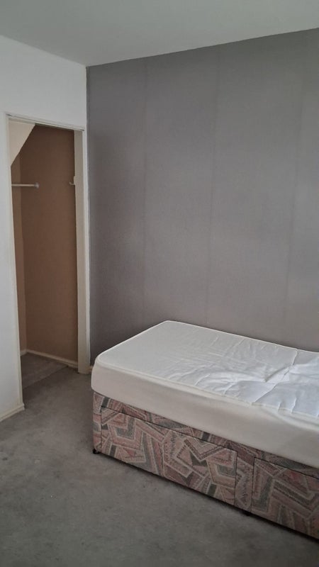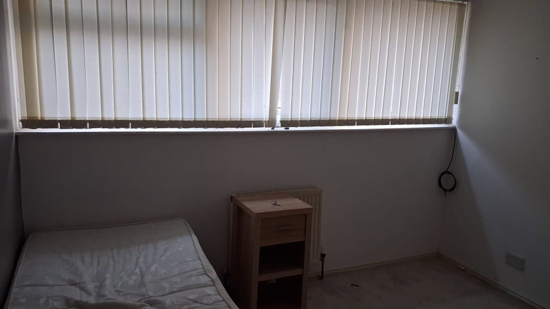 Comes with a white bed, closet/wardrobe with shelving, white Ikea chest of drawers and bedside table.
