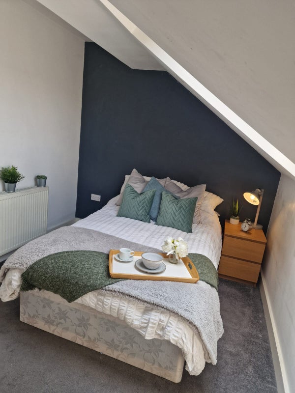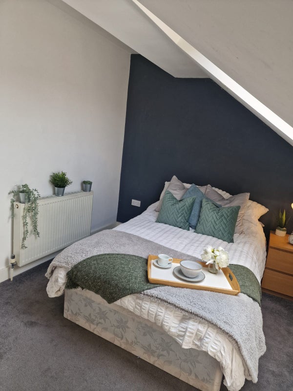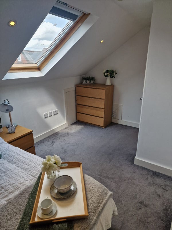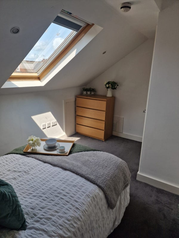 The double bedroom is beautifully decorated and comes fully furnished with comfortable double bed, built in wardrobe, 4 x Malm chest of drawers and 2 x bedside drawers. The room has a grey statement wall, modern grey carpet and blackout curtains. The room is on the top floor at the front of the house and has a big Velux window.