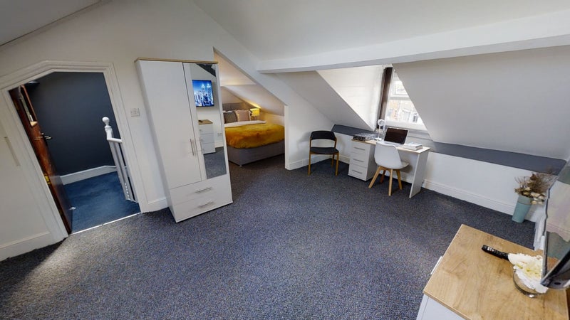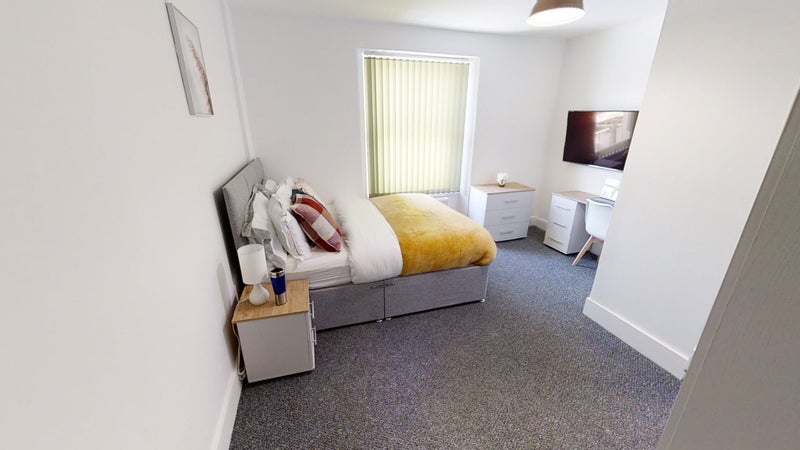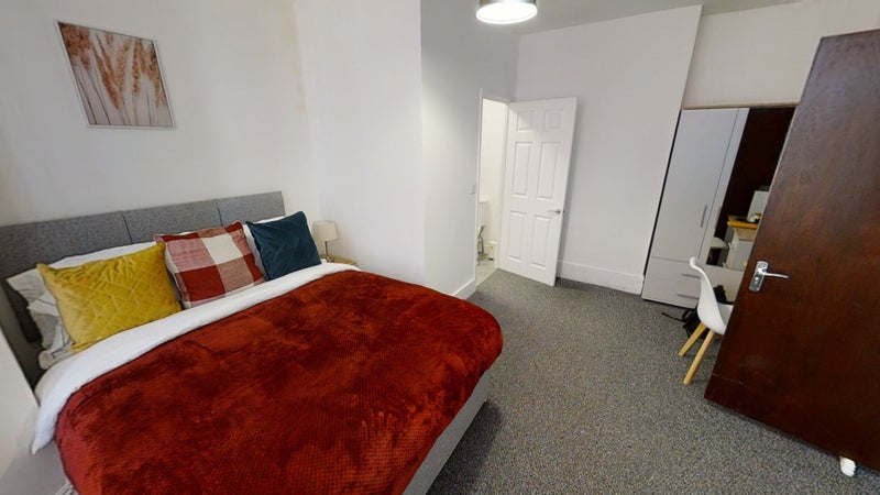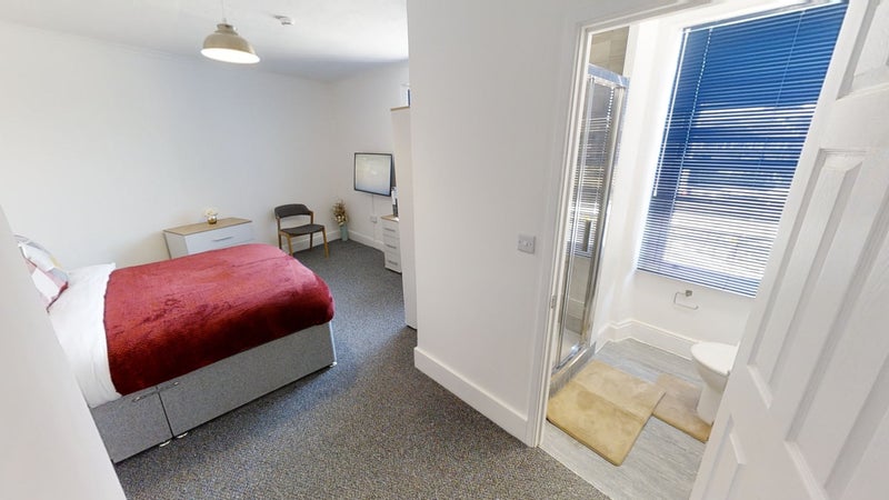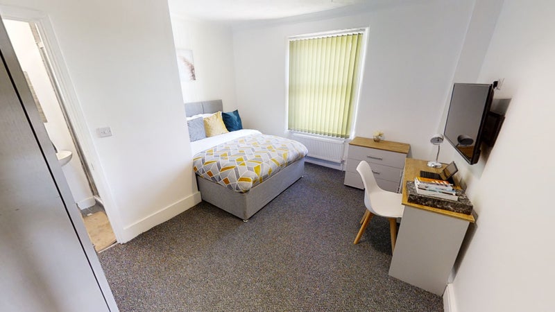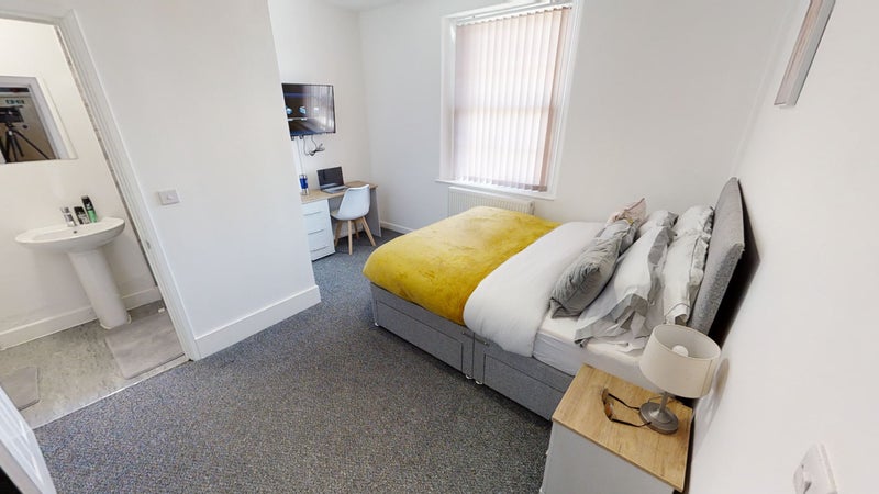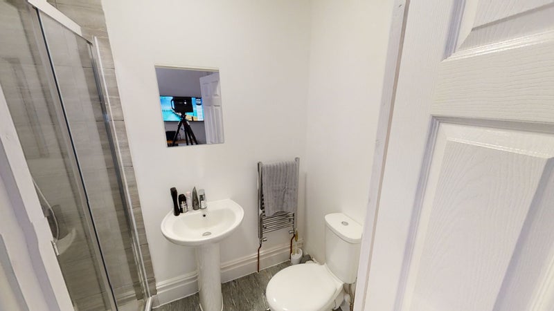 The bedrooms are fully furnished with double beds, bedside tables, wardrobes and desk space and each room has a wall mounted flat screen TV. There's a fabulous shower room with walk-in shower cubicle, low level WC and wash hand basin in each room for each housemate.