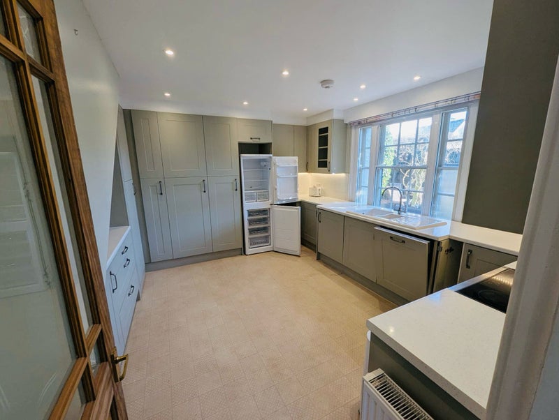 Well designed, newly fitted kitchen (14’ 5” x 14’ 5” max), including cooker, dishwasher, washing machine and fridge-freezer, kettle, toaster and microwave.