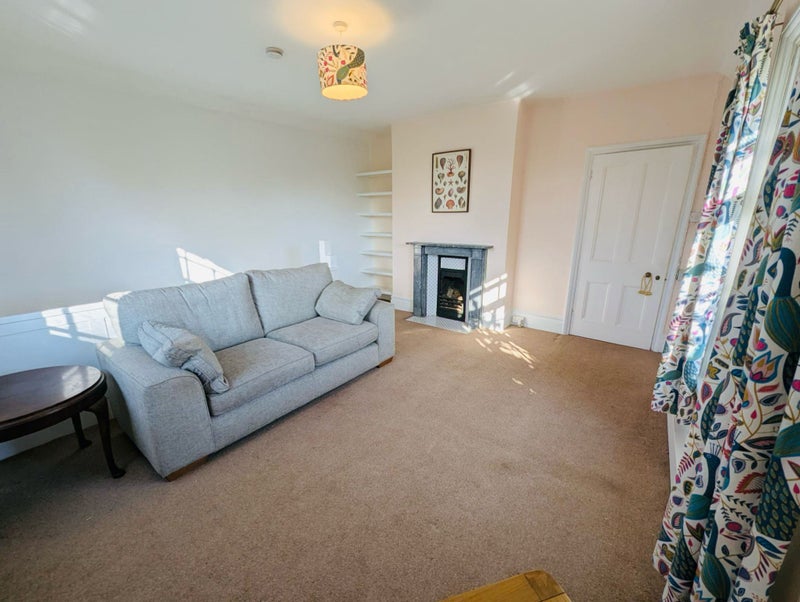 Sizable and sunny living room (14’ 5” x 14’ 1” max), including sofa, coffee table and built in shelving. The lounge has a fireplace (not functional).