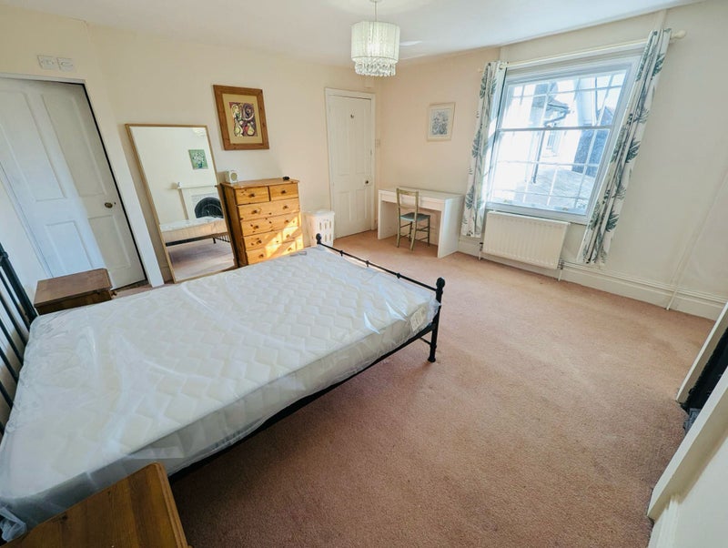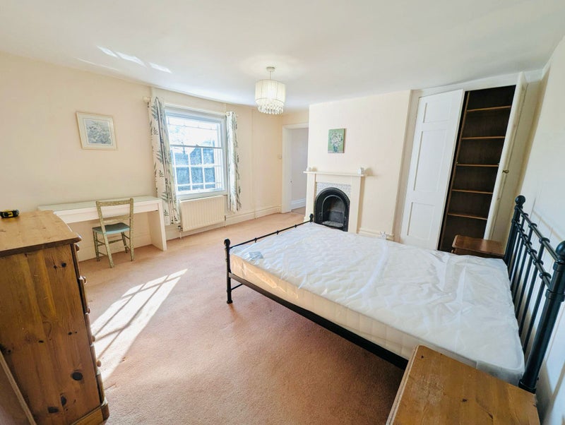 Spacious bedroom (13’ 10” x 13’ 6”), including built-in wardrobe, double bed, bedside tables, dressing table, full length mirror and chest of drawers. The bedroom also has a fireplace (not functional).