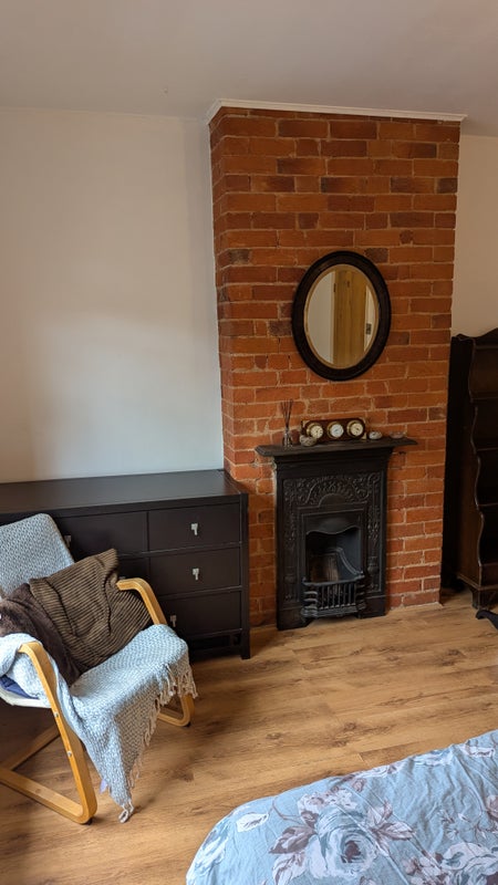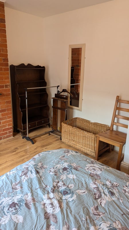 The room is at the front of the house with double bed, matching chest of drawers and bedside tables and a bookshelf. There is also a couple of chairs, a clothes rail, full length mirror and bedside lamp. Sash windows with wooden blinds, laminate floor and lockable door. The room has a cast iron fireplace (not working for decoration only) and feature brick wall. Radiator with its own thermostat and radiator cover.