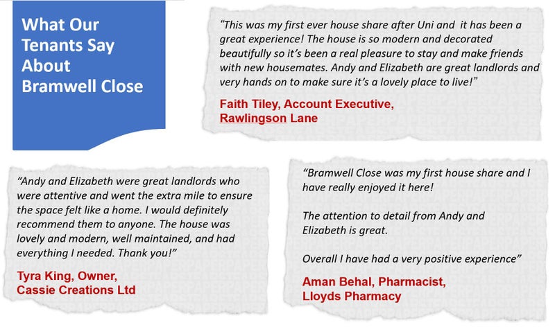 ‘This was my first ever house share after Uni and it has been a great experience! The house is so modern and decorated beautifully so it’s been a real pleasure to stay and make friends with new housemates. Andy and Elizabeth are great landlords and very hands on to make sure it’s a lovely place to live!’