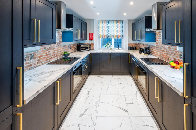 The communal and kitchen are both finished with white marble flooring, making it not only look sleek but easy to keep clean.