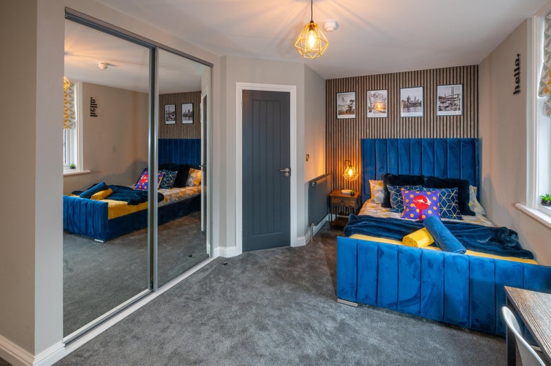 The room itself is beautiful. The room has plenty of light in the day and is a cosy bedroom when the bespoke black out blind is drawn. There is a large, upholstered midnight navy double bed with bedside table and designed caged industrial style bedside lamp. The room will come with the bed and mattress however bedding is not provided. The rooms are dressed for illustrative purposes only.