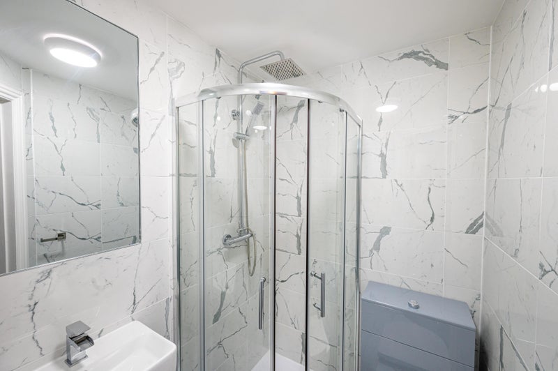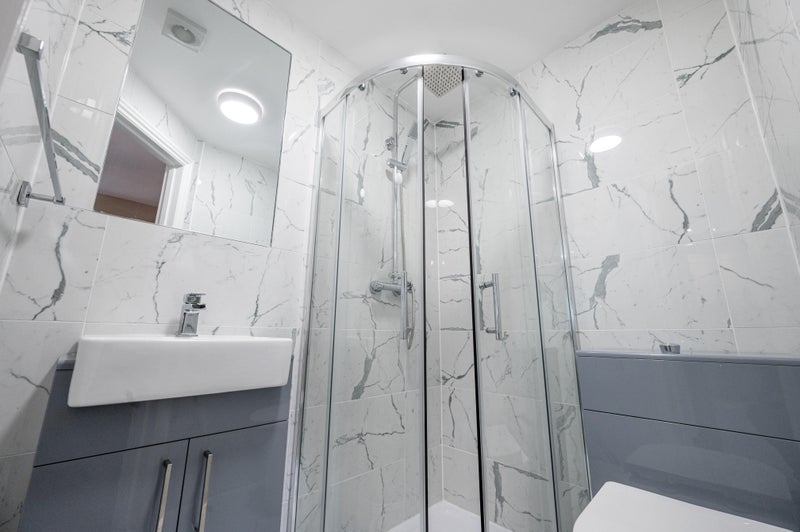 WOW, the en-suite must be the best part. This floor to ceiling marble tiled bathroom is one of a kind. There is a built in mirror with glass grey vanity unit, perfect for storage. The shower has sliding doors with great pressure rainfall shower head and detachable hose.