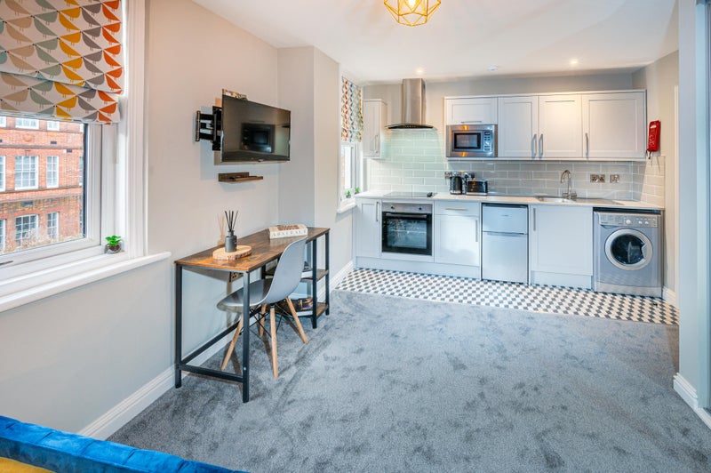 The studio has its own kitchenette fully equipped with everything you need. There is oven & hob, washer/dryer, toaster, kettle, microwave sink, cupboards & storage. Along with being entirely self-contained you still have access to all communal areas.