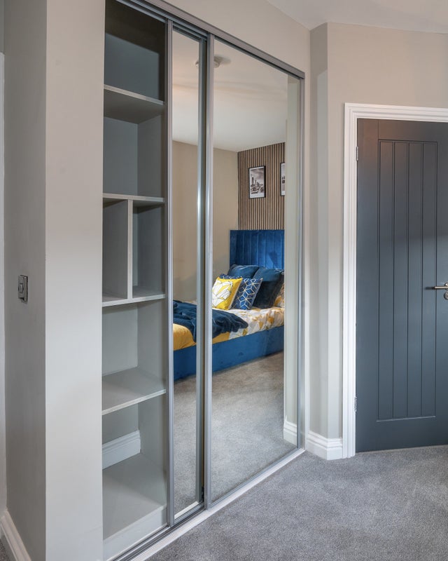 This room offers a huge amount of storage with a bespoke built in wardrobe. The wardrobe has 2 large mirror sliding door which open to one side of bespoke compartments perfect for folded clothes. The other side offers two rails and floor space for shoes. There is also a large amount of space perfect for suitcases at the top of the wardrobe.