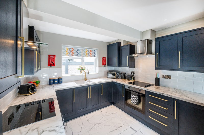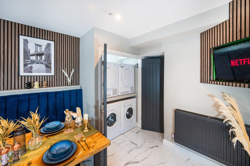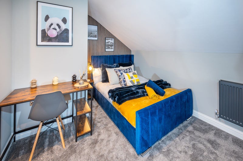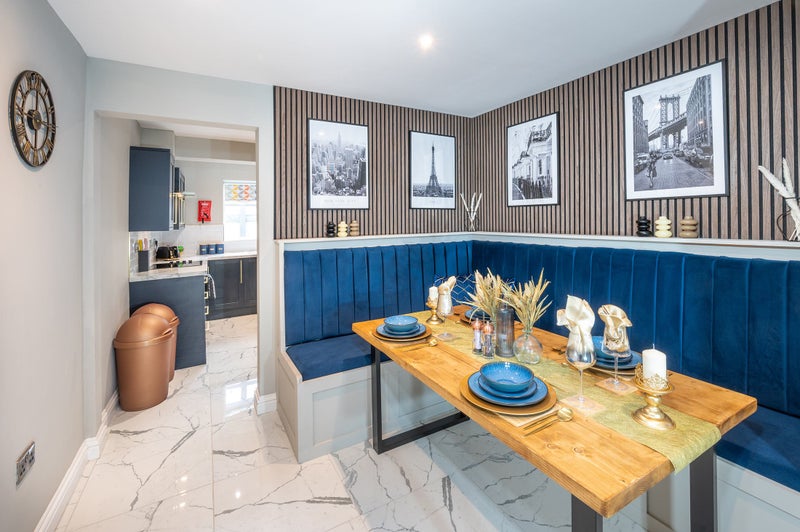 The house has amazing, shared facilities, The communal area has a bespoke upholstered seating bench in a stunning midnight navy. There is then a cut to size dining table in industrial wood. This area is perfect for eating meals and unwinding or can be used for work. There is a 32" Smart Tv also.