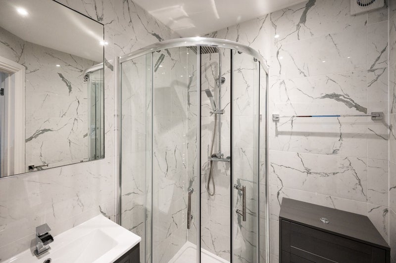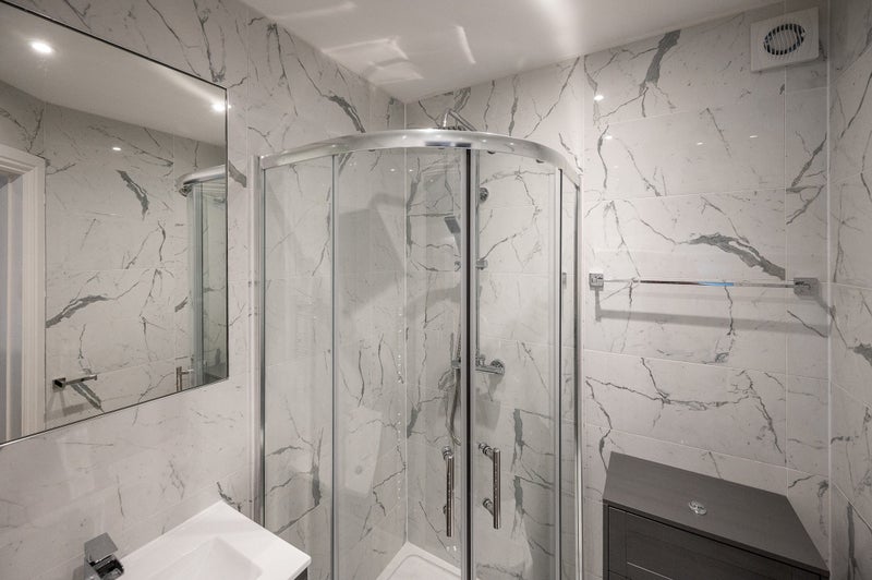 WOW, the en-suite must be the best part. This floor to ceiling marble tiled bathroom is one of a kind. There is a built-in mirror with glass grey vanity unit, perfect for storage. The shower is a walk-in shower with huge shower tray. so much room. There is a rainfall shower head and detachable hose.