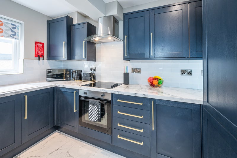 The apartment has plenty of light in the day and is a cosy bedroom when the bespoke black out blind is drawn. There is a large, upholstered midnight navy double bed with bedside table and caged industrial style lamp. The room will come with the bed and mattress however bedding is not provided. The rooms are dressed for illustrative purposes only. The 32” Smart TV is located at the end of the bed. This is above the workstation.