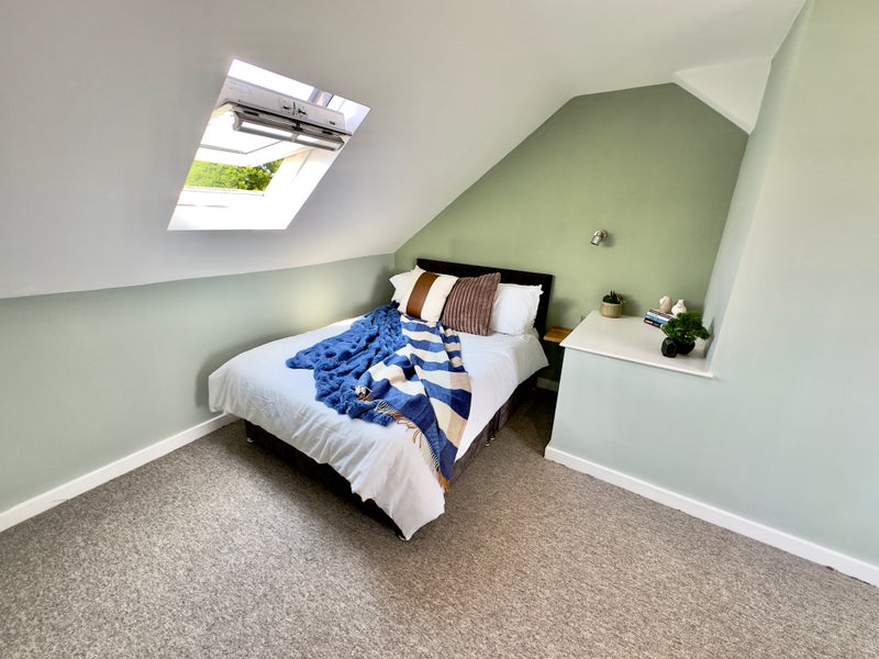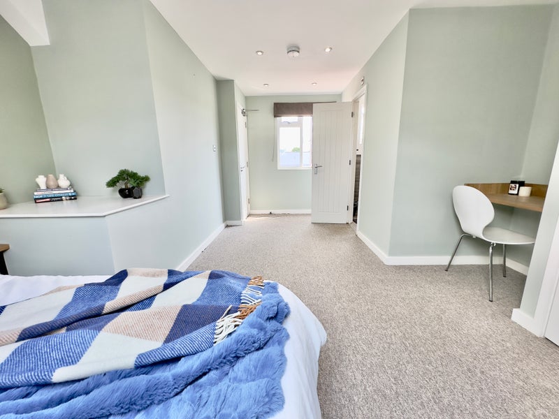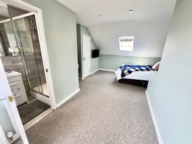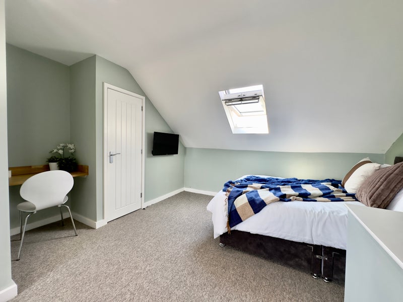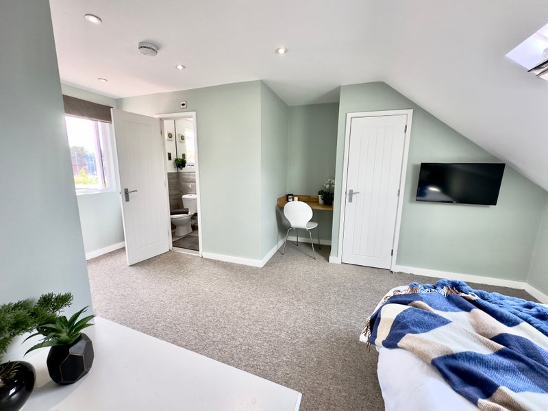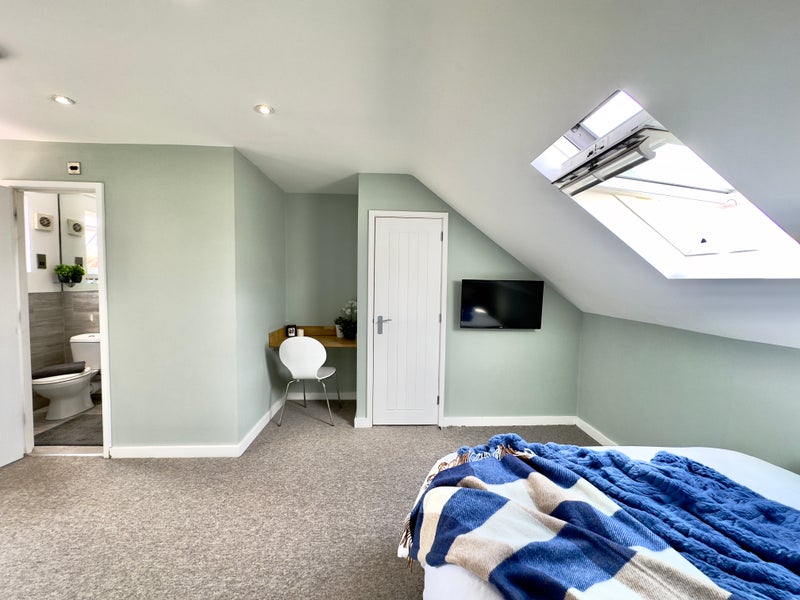 🟡 A lovely, spacious double en-suite loft bedroom. The room includes a desk and chair, a mirrored fitted wardrobe, Ethernet ports for gamers, a large SMART TV, storage space under the bed, a large window to let in light, and a fabulous en-suite bathroom. This room is for those who love SPACE and a bit of privacy.