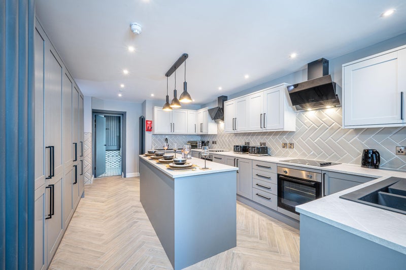 The design is stunning, with 3 ovens, 3 4-burner hobs, 3 microwaves, 3 sinks, 3 kettles, 3 4-slice toasters and 4 full height fridge freezers there is more than enough space for everyone!