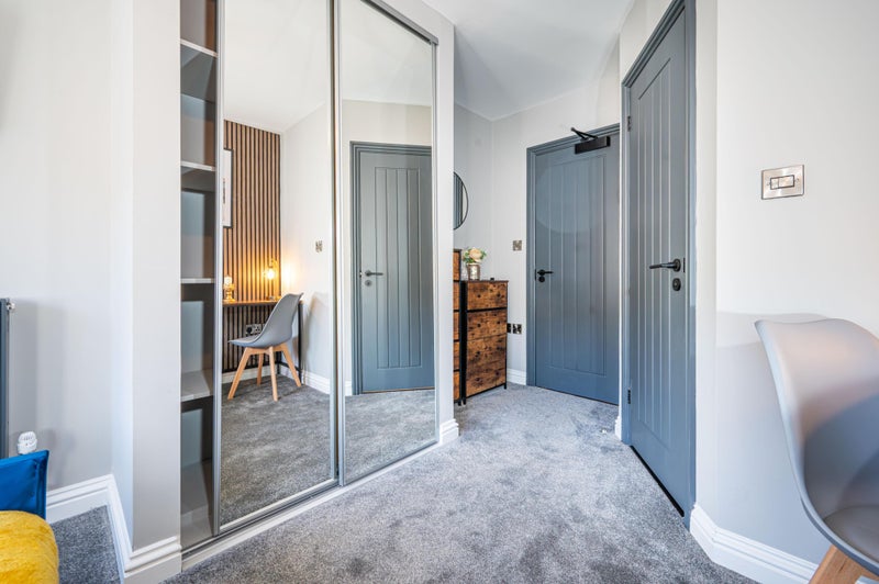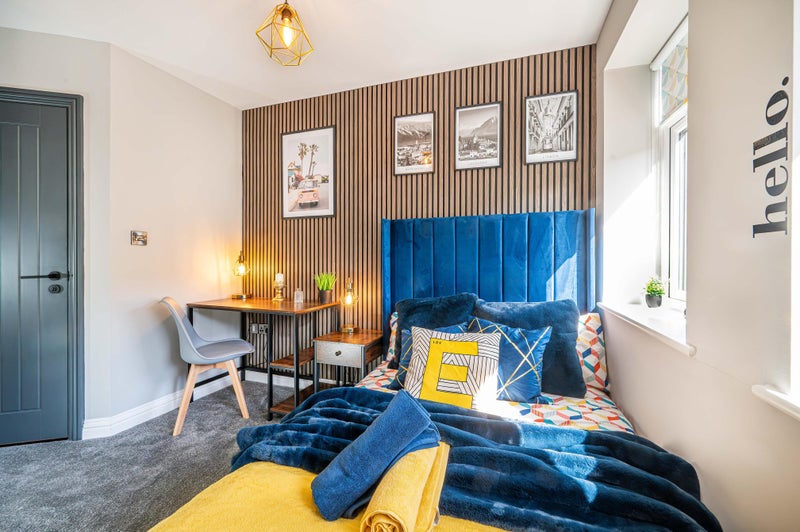 All the rooms in this house have been designed with the highest quality materials and we have made sure to keep the high end feel throughout the process. The design scheme is modern and industrial with feature wood panelling, grey and black accents plush carpeting throughout, fully built in mirrored wardrobes and midnight navy upholstered beds with memory foam mattress.