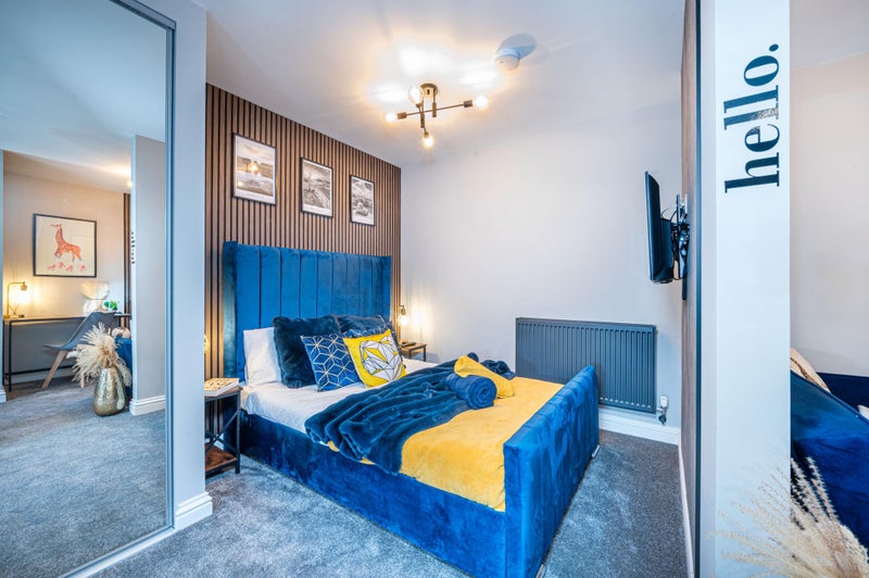 ⭐️ All Units come with our signature Double Midnight Navy upholstered bed with memory foam mattress ensuring you have the best night’s sleep