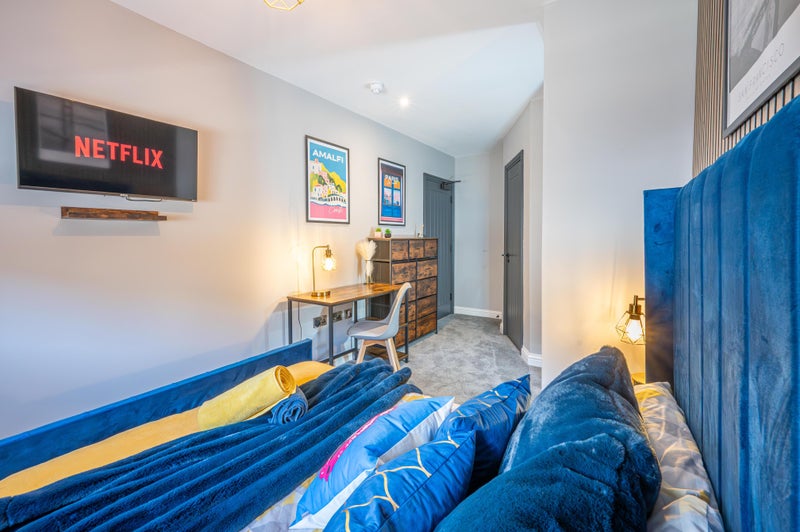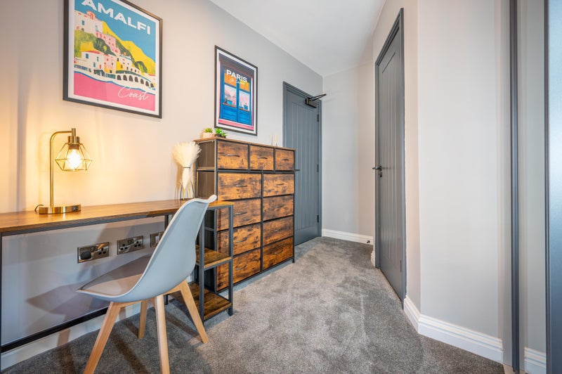 The desk is central against the wall of the room in between a large chest of drawers (LOADS of storage) and the smart TV perfect for working from home. The ethernet point and a duo of sockets is directly behind it.
