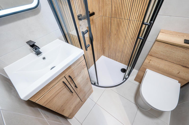 ✅ Bespoke panelled and sand toned ensuite bathrooms with built in light mirrors and wooden effect vanity unit & toilet basin