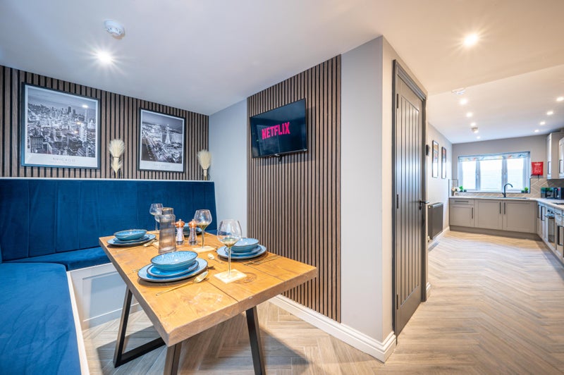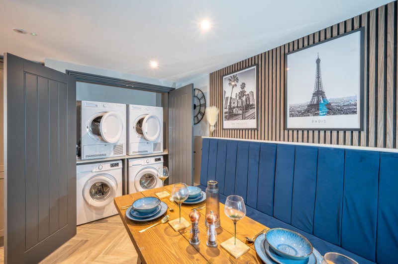The communal has a luxury seating bench upholstered in midnight navy with 32" Smart TV perfectly positioned in front against the feature panelling. A perfect place for eating meals or just winding down after a long day.