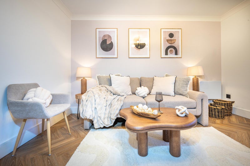 The living room comes fully equipped with 2-seater sofa in a cosy taupe shade, with matching monochrome and taupe cushions and fluffy mocha throw too, just to make the most of cosy movie nights in!