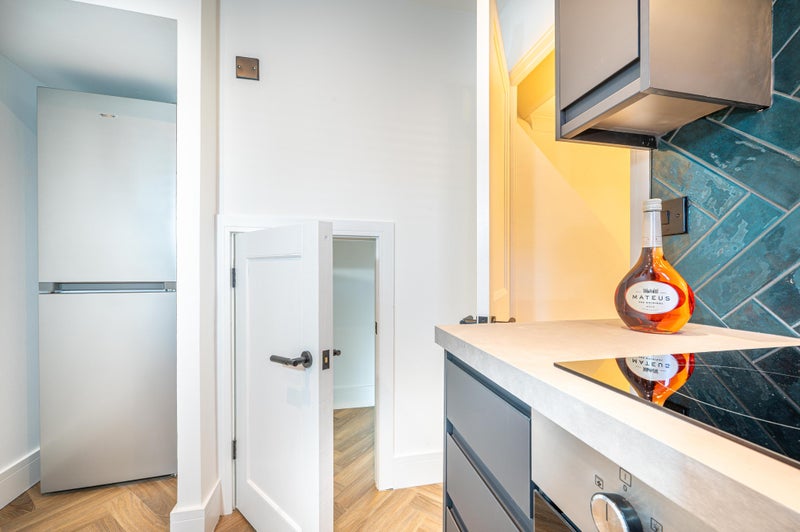 As you continue along through the white door from the living room you will be greeted with your modern kitchen!