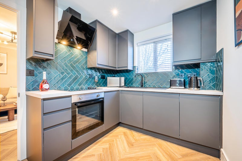With all integrated appliances in sleek Charcoal grey cabinets, and STUNNING deep emerald green splashback tiles, it truly looks like a show home, but perfectly made for easy clean up! The kitchen comes fully equipped with washing machine, dishwasher, microwave, 4 burner electric hob, oven, toaster and kettle, as well as sink and basin plus LOADS of storage!