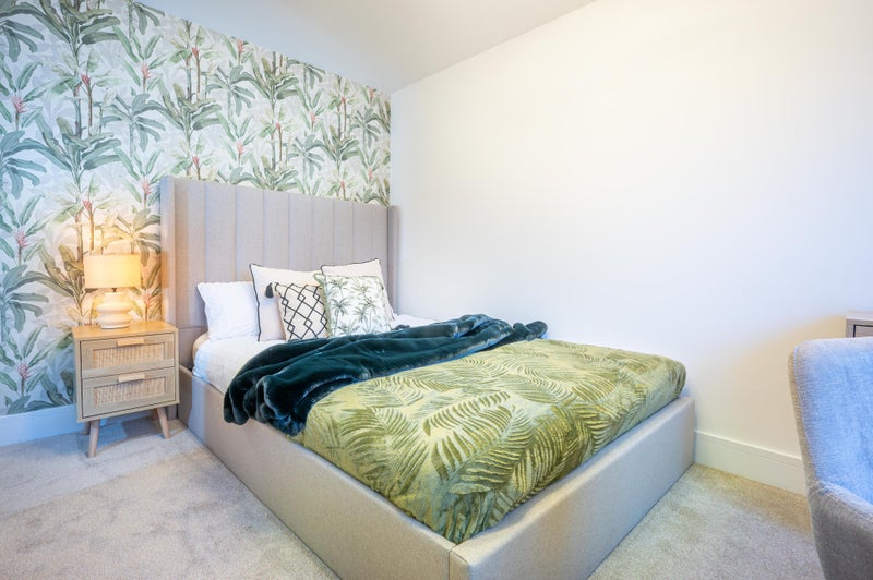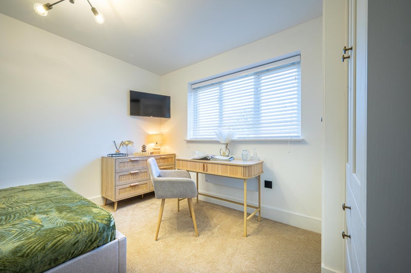 With jungle leaf feature wallpaper as the backdrop to add a touch of muted colour and a 32” smart TV at the foot of the bed you can rest in peace! Under the TV we have provided another set of wood and rattan effect storage drawers for all the little things, and a wood effect dressing table/desk area under the massive Window facing the front of the property.