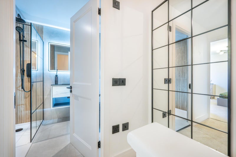 There is even an extra storage cupboard where you will find your own henry hoover and mop hiding for an easy clean up! Going back to the living room and up the sand carpeted stairs you will find your lovely full length black grid effect mirror, perfect for those morning selfies.