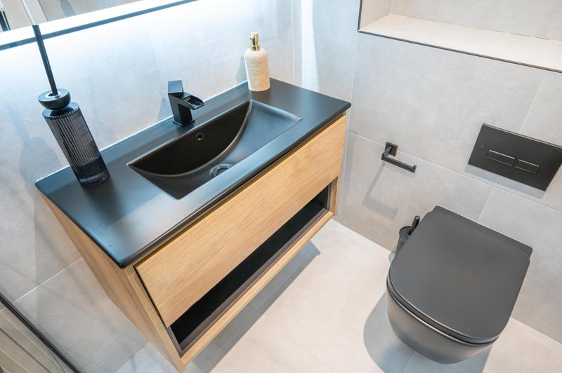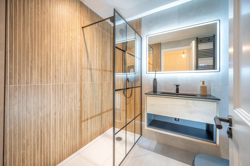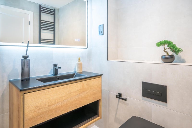 The extra-large black sink unit with push to close wood effect under storage is perfect for keeping all the toiletries close and with the high-tech light up LED mirror (with de-mist and music capabilities!) you can start the morning off bright.