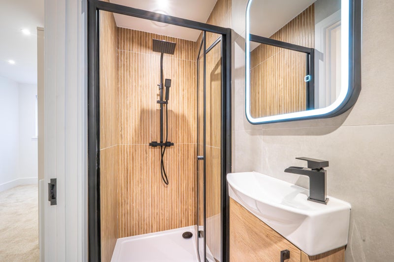 With similar design to the main bathroom, sandstone tiling, wood effect vanity under the white sink unit, toilet, light up LED mirror and your own shower with wood effect splashback tiles and rainfall head with detachable hose you can still get ready for your day even if the bathroom downstairs has been taken over!