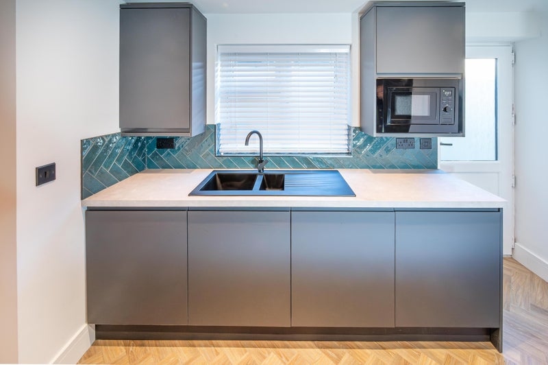 The Dining area seamlessly melts into the kitchen, with beautiful deep emerald splashback tiles, countless Charcoal units for the integrated appliances and as much storage as we can provide, dove grey worktops and sleep black extractors to match, this kitchen looks exactly like a show home!