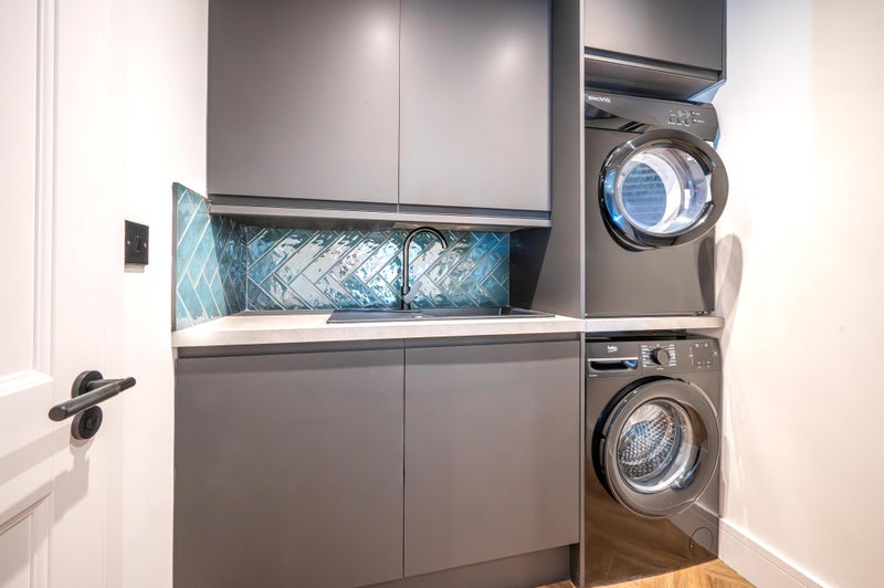 The kitchen leads gain to the Utility room. Here you will find the room follows the sleek design of the kitchen, with the deep jade tiles following through for your hand washing sink basin, and to your right in the room you will find your matching black washing machine on the bottom and black dryer on the top as well as charcoal units so you can keep all the laundry detergents out of the way too!