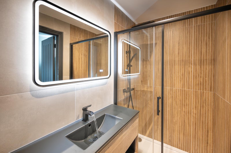 ✅ Bespoke white marble floor to ceiling tiled ensuite bathrooms with integrated mirrors and matching grey vanity unit & toilet basin