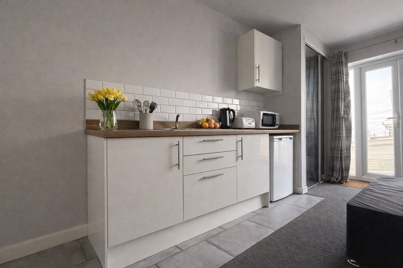 Fully furnished with a double bed, built-in wardrobe, drawers and TV. The room also includes a private kitchenette with sink, under-counter fridge and storage.
