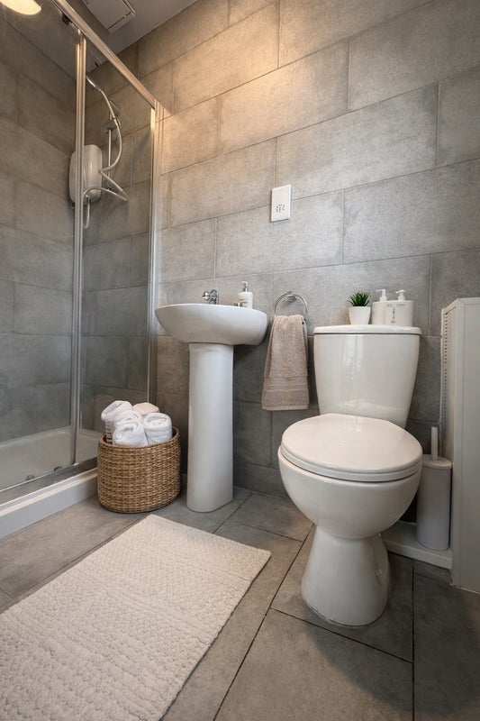 Modern ensuite with shower, basin and WC.
