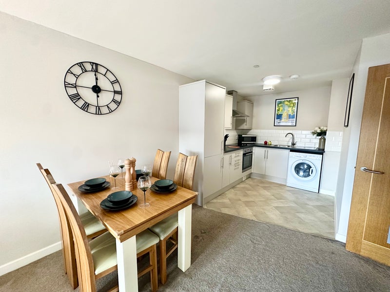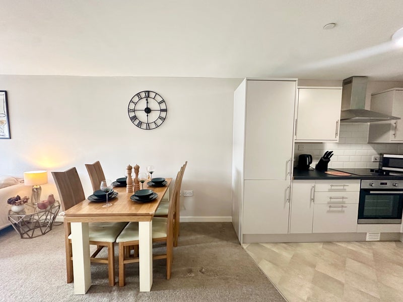 Your Kkitchen is open plan with solid wood Dining table, the kitchen has a beautiful design, the kitchen is a wraparound shape with grey units, silver accents, white tiled splashback and black worktops, with grey tile effect floor to match.
